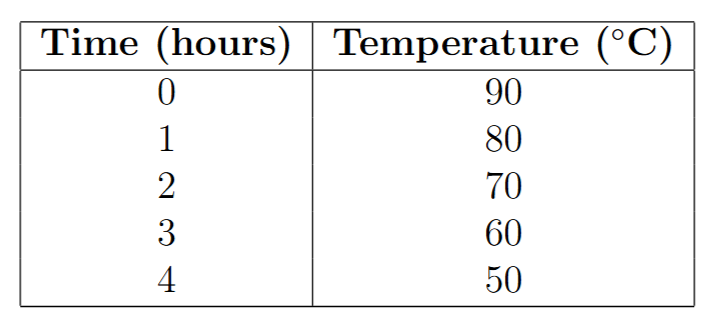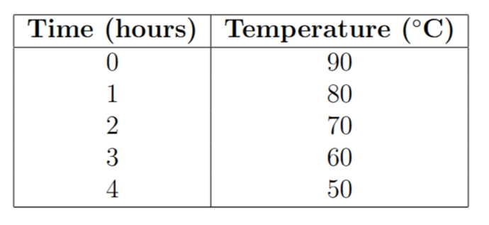 A café manager records the temperature of a pot of tea over several hours (time measured from when the tea was first brewed). The data is shown below: