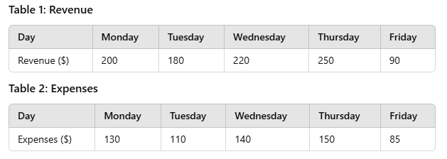 A small café tracks its daily Revenue and Expenses (in $) for one workweek (Monday–Friday). The tables below show the data: