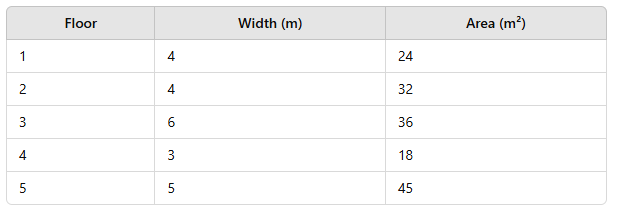 A furniture store is measuring 5 rectangular display floors for a renovation project. The following table shows each floor’s width and area (in square meters):